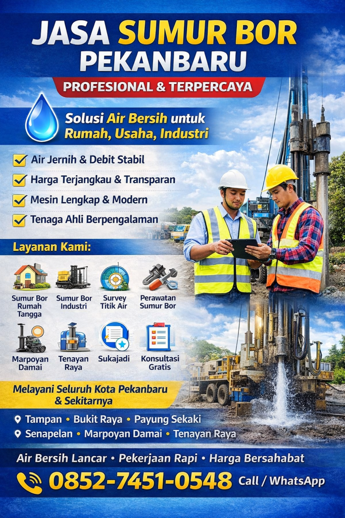 Ketersediaan air bersih yang stabil menjadi kebutuhan utama bagi masyarakat dan pelaku usaha di Kota Pekanbaru. Untuk mengatasi masalah air PDAM yang tidak lancar, air keruh, atau kebutuhan air skala besar, sumur bor adalah solusi paling efektif dan berkelanjutan.