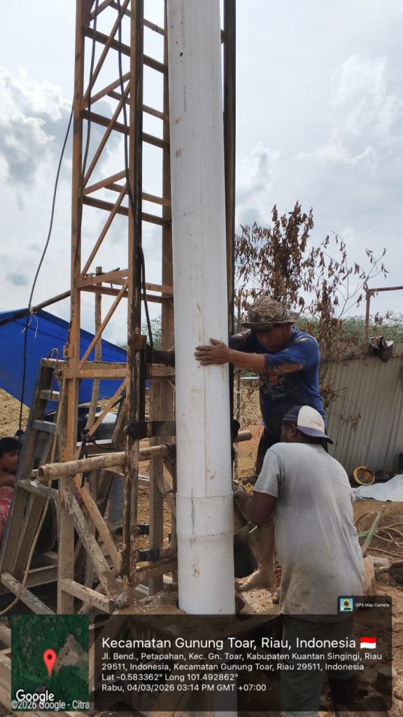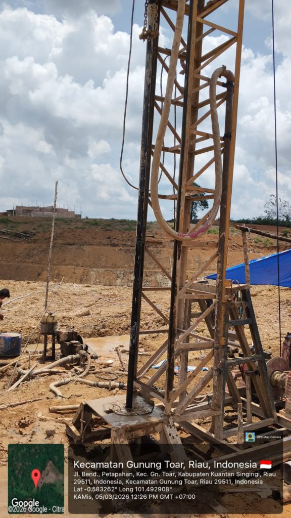 Inilah tahap inti. Kami melakukan pengeboran dengan teknik Mud Rotary atau teknik lain yang disesuaikan dengan kondisi tanah di Kuantan Singingi.